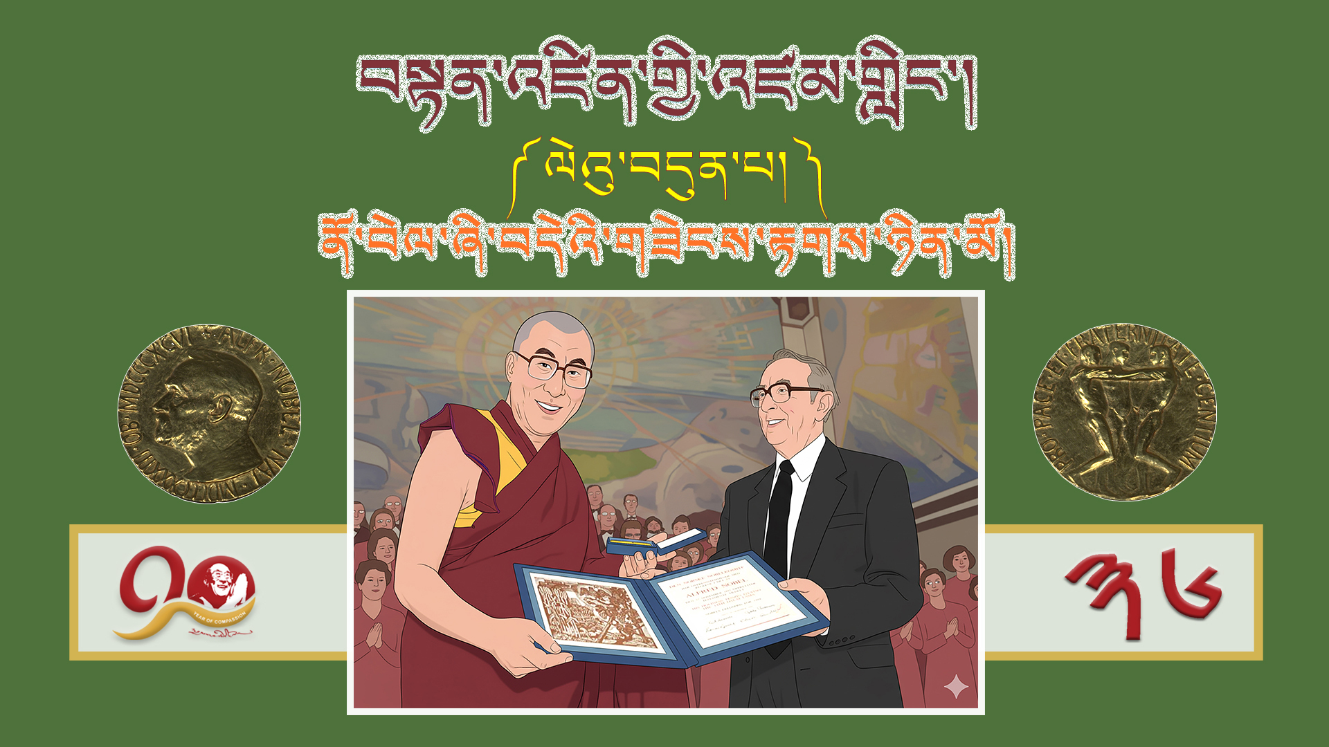 ༄༅། །བོད་མིའི་བླ་ན་མེད་པའི་དབུ་ཁྲིད་སྤྱི་ནོར་༸གོང་ས་༸སྐྱབས་མགོན་ཆེན་པོ་མཆོག་ལ་ཕྱི་ལོ་ ༡༩༨༩ ལོར་ནོ་བེལ་ཞི་བདེའི་གཟེངས་རྟགས་འབུལ་བཞེས་མཛད་ནས་ལོ་ངོ་ ༣༦ འཁོར་བའི་དུས་ཆེན་དང་། རྒྱལ་སྤྱིའི་འགྲོ་བ་མིའི་ཐོབ་ཐང་ཉིན་མོ། ༸གོང་ས་༸སྐྱབས་མགོན་ཆེན་པོ་མཆོག་གི་༸སྐུའི་གོ་སྟོན་དང་བསྟུན། རྒྱལ་སྤྱིའི་ཁྱོན་ཡོངས་ལ་ལོ་ཧྲིལ་པོར་བྱམས་བརྩེའི་ལོ་ཞེས་གཞུང་འབྲེལ་སྲུང་བརྩི་ཞུ་བཞིན་ཡོད།