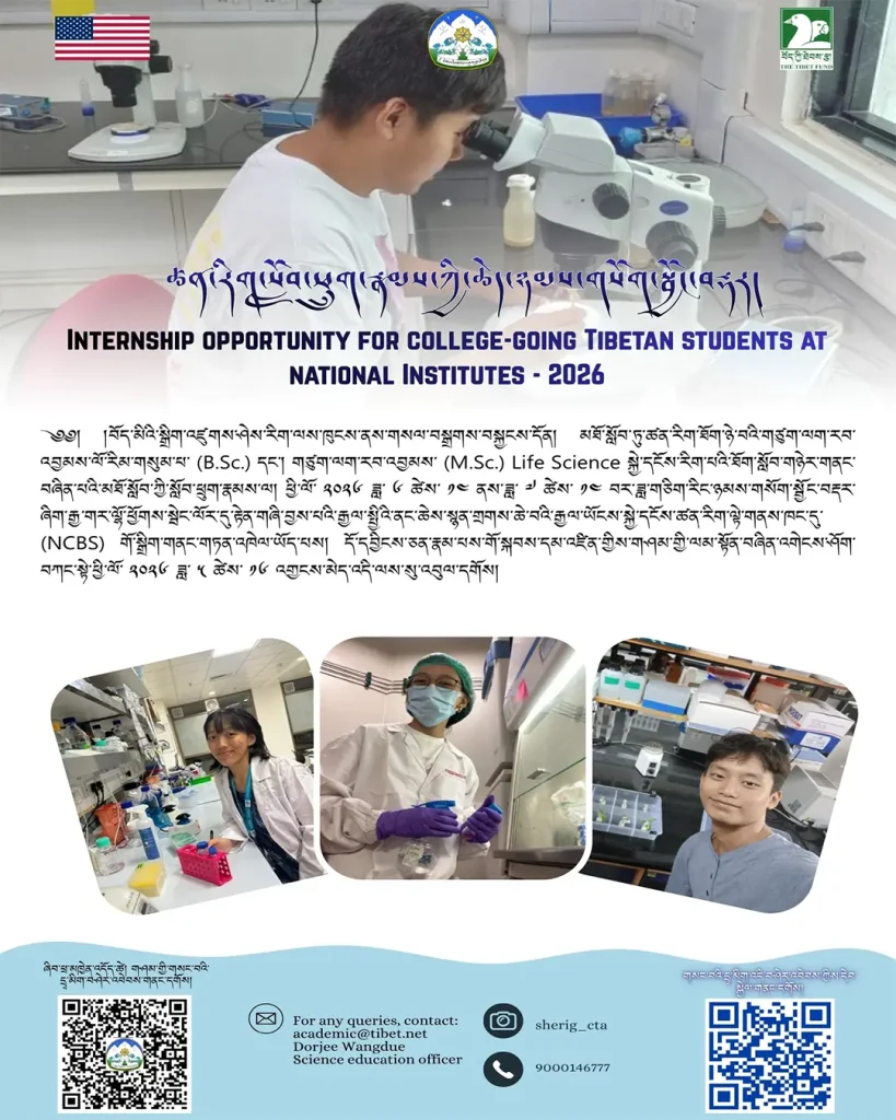 ༄༅། །བོད་མིའི་སྒྲིག་འཛུགས་ཤེས་རིག་ལས་ཁུངས་ནས་གསལ་བསྒྲགས་བསྐྱངས་དོན། མཐོ་སློབ་ཏུ་ཚན་རིག་ཐོག་ཉེ་བའི་གཙུག་ལག་རབ་འབྱམས་ལོ་རིམ་གསུམ་པ་(B.Sc.) དང་། གཙུག་ལག་རབ་འབྱམས་ (M.Sc.) LifeScience སྐྱེ་དངོས་རིག་པའི་ཐོག་སློབ་གཉེར་གནང་བཞིན་པའི་མཐོ་སློབ་ཀྱི་སློབ་ཕྲུག་རྣམས་ལ། ཕྱི་ལོ་༢༠༢༦ ཟླ་ ༦ ཚེས་ ༡༤ ནས་ཟླ་ ༧ ཚེས་ ༡༤ བར་ཟླ་གཅིག་རིང་ཉམས་གསོག་སྦྱོང་བརྡར་ཞིག་རྒྱ་གར་ལྷོ་ཕྱོགས་སྦེང་ལོར་དུ་རྟེན་གཞི་བྱས་པའི་རྒྱལ་སྤྱིའི་ནང་ཆེས་སྙན་གྲགས་ཆེ་བའི་རྒྱལ་ཡོངས་སྐྱེ་དངོས་ཚན་རིག་ལྟེ་གནས་ཁང་དུ་ (NCBS) གོ་སྒྲིག་གནང་གཏན་འཁེལ་ཡོད་པས། དོ་དབྱིངས་ཅན་རྣམ་པས་གོ་སྐབས་དམ་འཛིན་གྱིས་གཤམ་གྱི་ལམ་སྟོན་བཞིན་འགེངས་ཤོག་བཀང་སྟེ་ཕྱི་ལོ་ ༢༠༢༦ ཟླ་ ༥ ཚེས་ ༡༦ འགྱངས་མེད་འདི་ལས་སུ་འབུལ་དགོས།