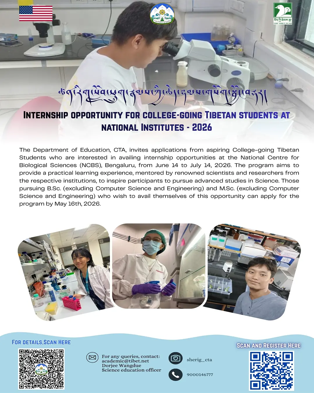 Dharamshala: The Department of Education, CTA, invites applications from aspiring College-going Tibetan Students who are interested to availing internship opportunities at the National Centre for Biological Sciences (NCBS), Bengaluru, from 14 June to 14 July 2026.